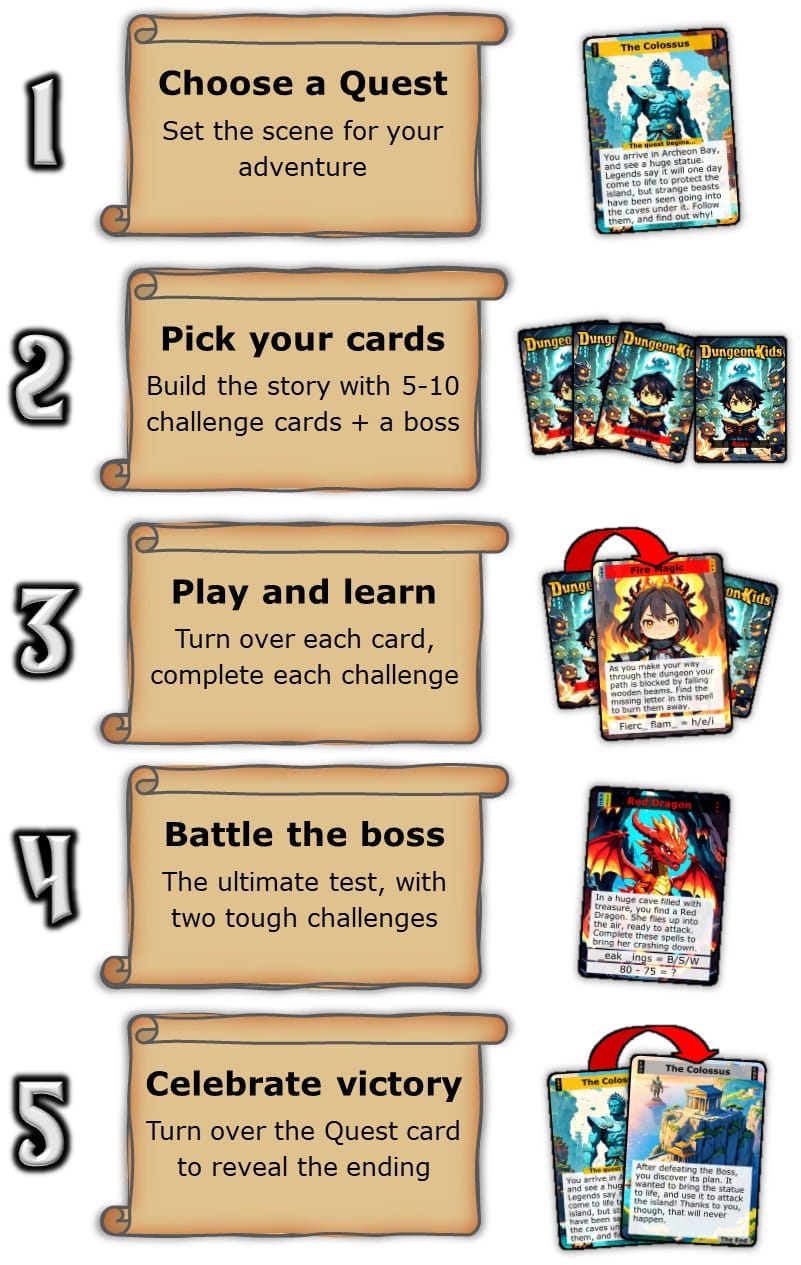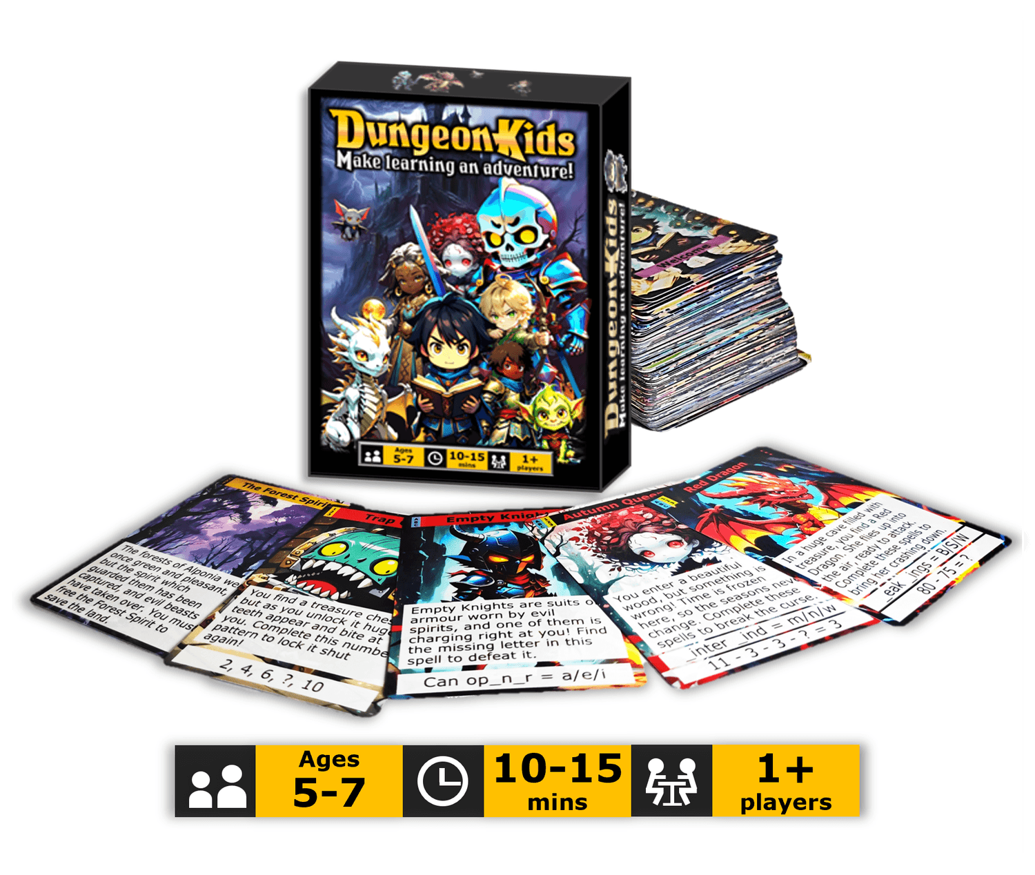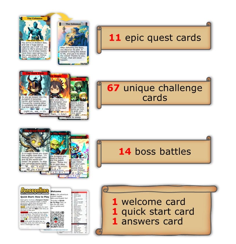 DungeonKids® is the epic adventure card game that makes learning Maths and English Fun!